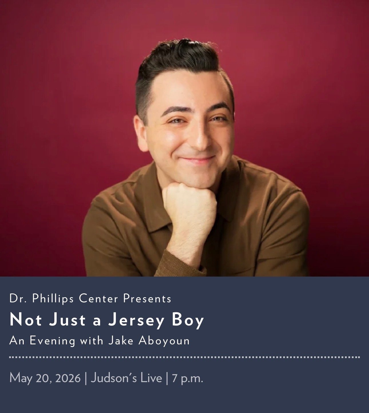 Not Just a Jersey Boy, An Evening with Jake Aboyoun is a one-man show inspired by Jake’s career as a performer, with a ton of Frankie Valli and Broadway hits mixed in!
